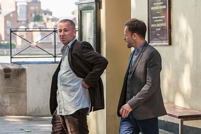 “Step Nine” — Holmes (Jonny Lee Miller, right) travels to London and comes to the aid of his older mentor, Gareth Lestrade (Sean Pertwee, left), on the second season premiere of ELEMENTARY, Thurs. Sept. 26 (10:00 – 11:00 PM, ET/PT) on the CBS Television Network. Photo: Joss Barratt /CBS ©2013 CBS Broadcasting, Inc. All Rights Reserved