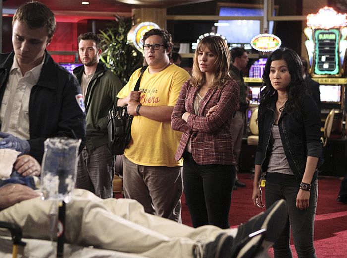 “Shorthanded” — Against Cabe’s advice, Team Scorpion heads to Las Vegas for a simple casino job, but a robbery leads to Walter’s arrest and the rest of the team is left to clear his name, on SCORPION, Monday, Oct. 13 (9:00-9:59 PM, ET/PT), Eddie Kaye Thomas as Toby Curtis, Ari Stidham as Sylvester Dodd, Elyes Gabel as Walter O’Brien, Katharine McPhee as Paige Dineen, Jadyn Wong as Happy Quinn. Photo: Sonja Flemming/CBS ©2014 CBS Broadcasting, Inc. All Rights Reserved