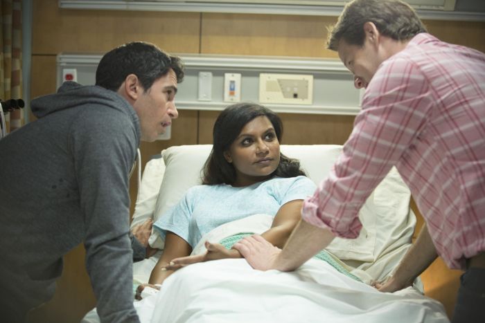 THE MINDY PROJECT: Danny (Chris Messina, L) and Morgan (Ike Barinholtz, R) are concerned when Mindy (Mindy Kaling, C) ends up in the hospital in the \”I Slipped\” episode of THE MINDY PROJECT airing Tuesday, Oct. 7 (9:30-10:00 PM ET/PT) on FOX. ©2014 Fox Broadcasting Co. Cr: Isabella Vosmikova/FOX